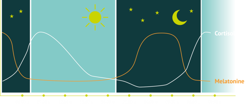 Normaal gesproken is de verhouding cortisol (stresshormoon) en melatonine (slaaphormoon) prima in balans. Ze hebben als het ware samen een 24-uurs ritme. Net een soort klok. Melatonine zorgt dat je makkelijk in slaap valt en blijft slapen, terwijl cortisol zorgt dat je wakker wordt en blijft.